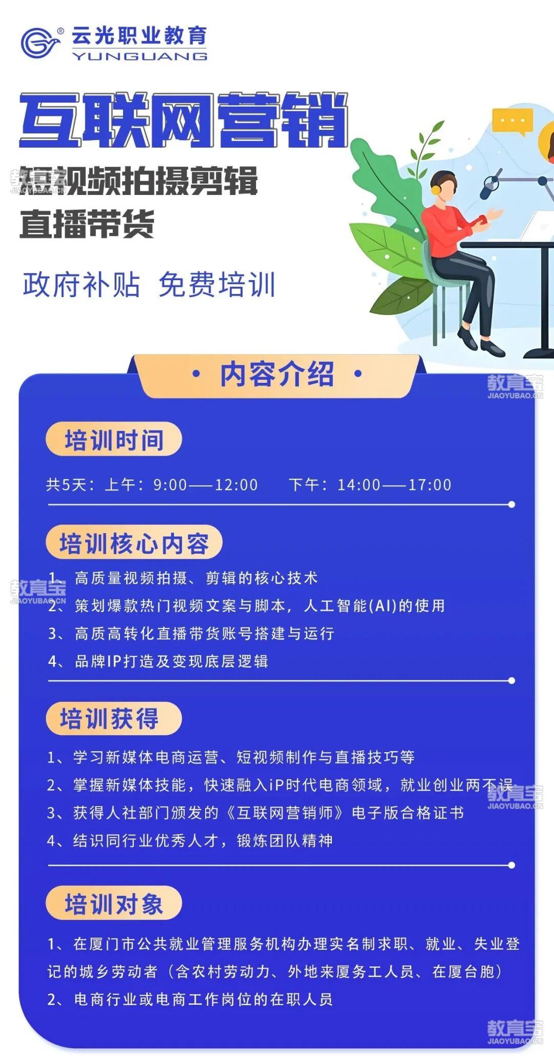 课程内容:邀请资深互联网营销师行业老师,课程主要讲解网络创业➕短视频拍摄剪辑➕直播带货+AI人工智能工具应用及文案创作。